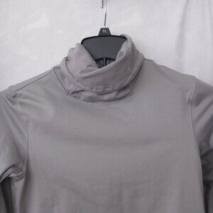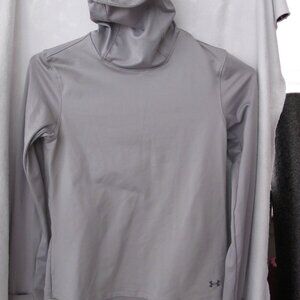 Great preloved condition - only worn a couple of times - Women's Under Armour Cold Gear Running Top - Size small. Gray coloring. Sleeves have thumb holes and fold-over cuffs to keep hands warm. Reflective logos and turtleneck neckline with bungee style adjustment to pull over nose/mouth and tighten to fit or just leave as turtleneck.