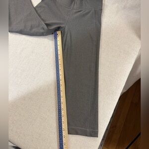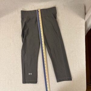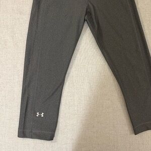 Under Armour capri-length compression leggings in heather gray. These heat gear leggings feature a wide elastic band and sturdy seams.