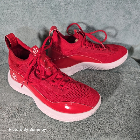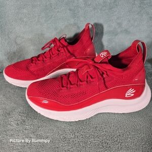 Under Armour Curry Flow 8, specifically in a red and white colorway. They are part of Stephen Curry's signature collection under the Curry Brand and were originally released in colorways such as "Red" or "Chinese New Year".