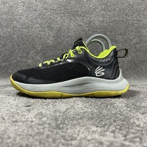 The Under Armour Curry GS 3Z6 Youth Size 4Y Black Lime Green Basketball Shoes are designed for young boys who want to emulate the style of basketball star Steph Curry. These athletic sneakers feature a solid black color with accents of lime green, perfect for school or sports activities. Made with synthetic upper material and a rubber outsole, these shoes offer comfort, breathability, and cushioning for optimal performance on the basketball court. Whether it's summer, fall, or spring, these Under Armour Curry 3Z6 shoes are a durable and stylish choice for active kids.
