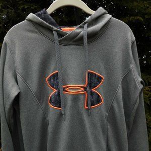 Under Armour gray fleece storm hoodie with gray/black stripe with flourescent coral outline big logo
