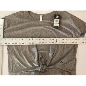 The product is a women's Under Armour cropped t-shirt in charcoal grey, featuring a front tie closure and a peek hole detail. This activewear top is made of a comfortable blend of cotton and polyester, perfect for workouts or casual wear. The size is XLarge, and it is designed for a regular fit. The cropped style adds a modern touch to the classic t-shirt, making it a versatile addition to any wardrobe.