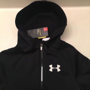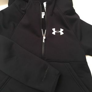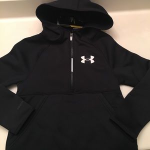 Armour Fleece fabric finished with highly water-resistant UA Storm technology. Soft, brushed inner layer traps heat for all-day warmth and comfort. Signature Moisture Transport System wicks sweat to keep you dry and light. Raglan sleeves unlock mobility for superior range of motion. Contrast binding detail. Front side hand pockets. Color blocked half zipper. 100% Polyester