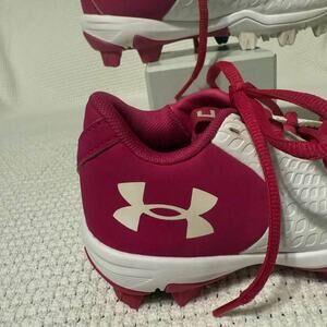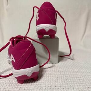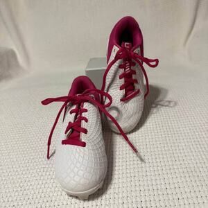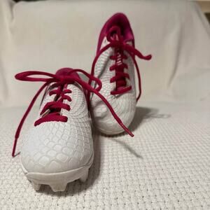 Like-new Under Armour cleats in girls’ size 11K. Worn just once or twice, with minimal signs of wear on the soles. Bright white and pink colorway with molded cleats for traction on grass or turf. Perfect for softball, soccer, or t-ball.