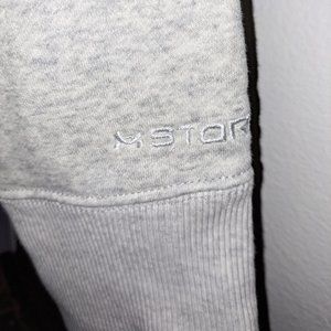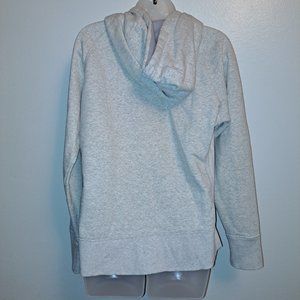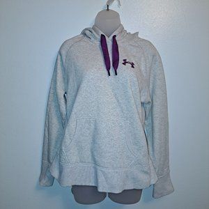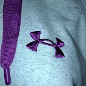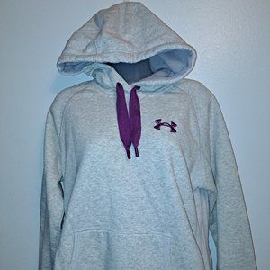 Cozy gray hoodie with purple drawstrings. Features Under Armour logo. Perfect for casual wear.