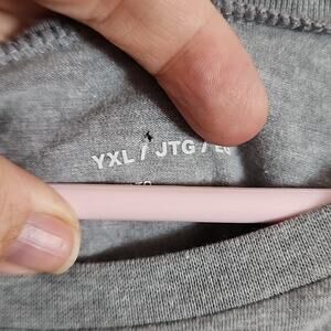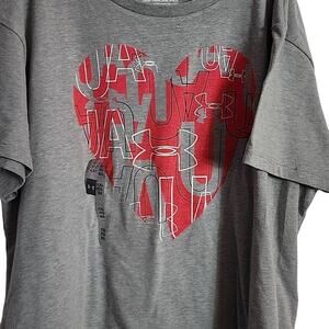 Gray tee with heart and UA logo. Note very small pinhole in last photo. This is from a tag that has been removed. Note that the store tag is still attached as shown in the first image.