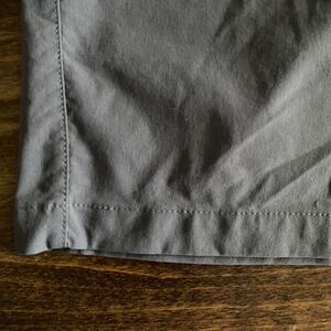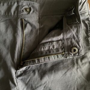 Zip & snap closure, belt loops, adjustable interior waistband, two front hip pockets, right back welt pocket, brand stitching on back right & left side seam, medium gray.