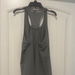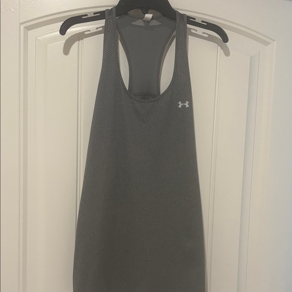 Under Armour racerback tank in gray. Breathable knit for workouts. Moisture-wicking fabric for sweat control. Slim, athletic cut for layering or solo wear.