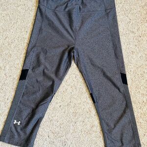 These Under Armour capris offer a sleek design with a heather gray base and contrasting black side inserts. Crafted from a stretchy, form-fitting material, they ensure comfort and flexibility for any workout. The wide elastic waistband provides a secure fit, making them ideal for athletic activities.