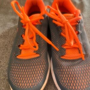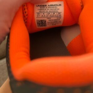 These Under Armour sneakers showcase a dynamic blend of gray and orange, featuring a breathable mesh upper for optimal airflow. Designed for athletic performance, they offer a modern look with vibrant orange accents on the laces and logo. The cushioned sole ensures comfort and support during any activity.