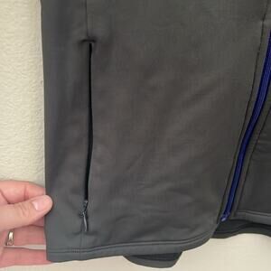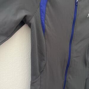Charcoal zip jacket with pockets. Textured panels and logo on front and back. Great running jacket! Has a few small spots on one sleeve, no tears or holes.