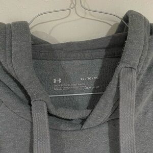 Under Armour hoodie in soft gray. Features bold red graphic on front. Ideal for casual wear or workouts.