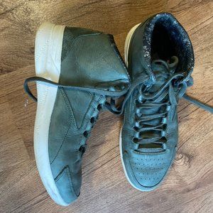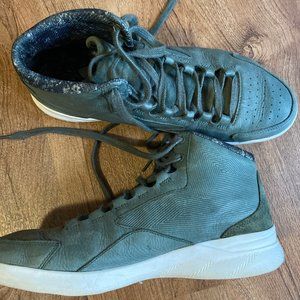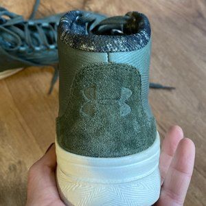 Under Armour high top sneakers in military green with snake skin accents. Size 8.5, only lightly worn.