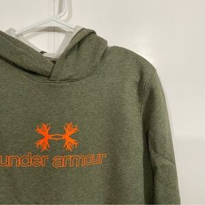 Gently worn women's size medium Under armour olive green and blaze orange hunting deer antler graphic logo pullover athletic hoodie sweatshirt. Quilted pocket texture, fleece lined, relaxed fit. Comes from a smoke free home, bundle with other items to save & minimize shipping cost.