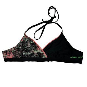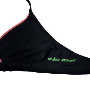 This Under Armour halter style bikini top features a back tie, a halter tie, mesh trim, and green raised vinyl logo.