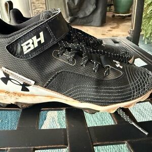 Dynamic Under Armour shoes with a black and white design. Features a secure strap and lace-up closure.