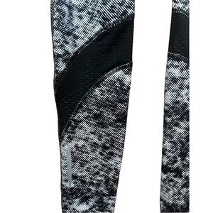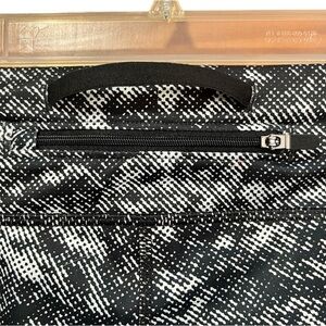 Black and white print with black vented material at back of legs. Reflective detail on legs makes these leggings great for running. Zippered pocket at back of waist.