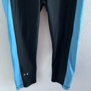 Under Armour Heat Gear Compression No Slip Waistband Capris Active Pants in black and blue with a silver logo. Spellout within the inner band. There's still an inner plastic hang tag.