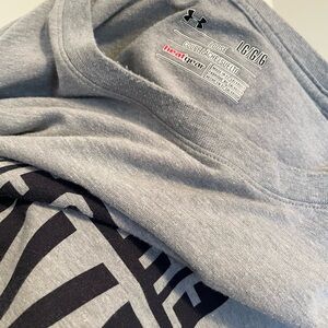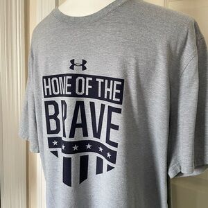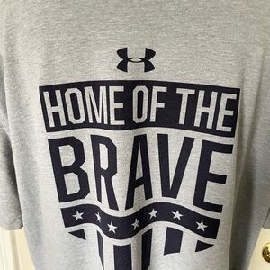 Pre-owned Under Armour Heat Gear Gray “Home of the Brave” Short Sleeve Tee. Men’s size Large. Loose, fit. Comfortable gray tee with 'Home of the Brave' graphic in dark navy blue. Perfect for casual wear. Minor manufacturer white threads, not as noticeable. See all photos.