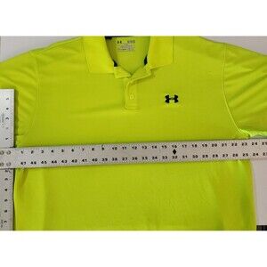 The Under Armour HeatGear Short Sleeve Men's Size XL Pullover Polo in Avocado Green is a stylish and functional piece of clothing designed for men who enjoy walking and golf. Made from a blended fabric, this polo offers comfort and breathability, making it perfect for active outdoor pursuits. The pullover style and loose fit provide ease of movement, while the short sleeves and neckline add a touch of breathability. With its signature Under Armour HeatGear technology, this polo ensures you stay cool and dry during your activities. Perfect for men looking for a high-performance athletic shirt in a vibrant yellow color.