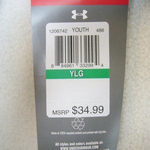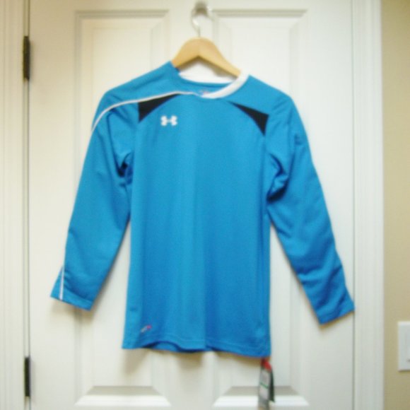New with tags youth Under Armour Heatgear soccer long sleeve shirt, small v neck, light padding at elbows, blue with black and white accents, size large. No rips tears stains, reg msrp #35