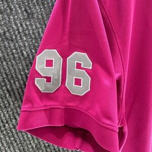 A vibrant pink Under Armour HeatGear polo shirt, designed for optimal performance and comfort. This short-sleeved polo features a classic three-button placket and the iconic Under Armour logo on the chest. The number '96' is prominently displayed on the sleeve, adding a unique athletic touch. Perfect for golf outings, casual athletic activities, or everyday wear, this polo combines style and functionality.