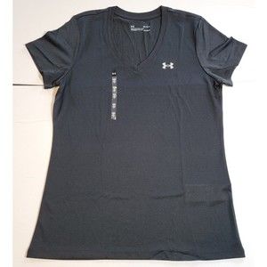 Item Name: Under Armour HeatGear Tech Short Sleeve V-Neck Shirt Women's M Black Solid Description: Get ready for your next workout with this Under Armour HeatGear Tech Short Sleeve V-Neck Shirt in size M. This black solid T-shirt is perfect for all your summer, fall, and spring activities, from gym and training to walking, cross training, CrossFit, yoga, and Pilates. Made of 100% polyester and with Under Armour's HeatGear technology, this shirt is lightweight, breathable, and easy to care for.