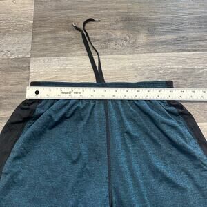 In great condition. Lightweight, elastic waistband with drawstring, blue-black heathered & color block pattern, pull-on style
