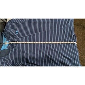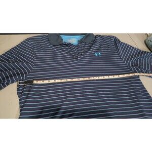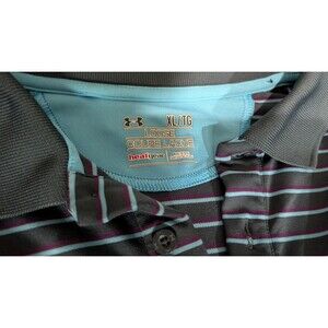 The Under Armour Heatgear Short Sleeve Polo Shirt in Men's XL is a stylish and comfortable option for those looking for a versatile piece of clothing. With a striped pattern in shades of gray, blue, and maroon, this collared shirt is perfect for casual or golfing occasions. Made from a polyester blend and featuring a loose fit, this polo is easy to care for with its machine washable fabric. Designed by Under Armour, this shirt is part of the HeatGear product line, ensuring high performance and quality for the wearer.