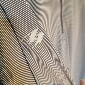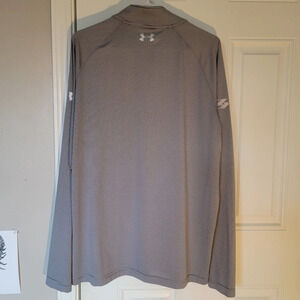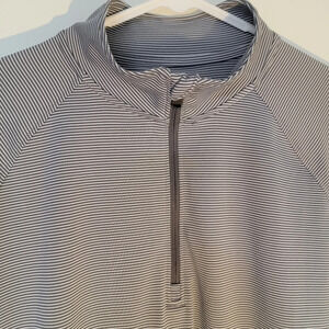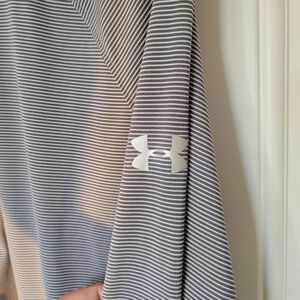 Under Armour Heatgear half zip pullover. Gray and white striped. Long sleeve. Casual. Lightweight. Excellent pre-owned condition. Please note the care label has been removed. Item has been washed in cold or warm water regular cycle. Tumble dry low.