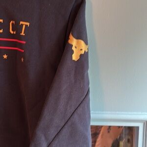 This dark blue sweatshirt is thick! It does run a bit small, so it fits more like a medium. Excellent condition