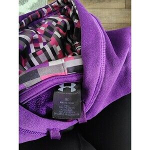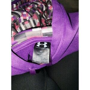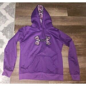 The product is a women's medium Under Armour hoodie in a solid purple color, made of polyester fleece material. It features a pullover closure, long sleeves, and an embroidered logo accent. The hoodie is part of the Under Armour Storm product line and is designed for activewear occasions with a loose fit. Machine washable and with a regular size type, this hoodie combines style and comfort for a variety of activities.