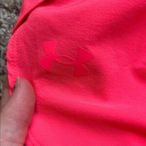 Hot pink under armor athletic shorts with spandex shorts under. The spandex shorts have pockets