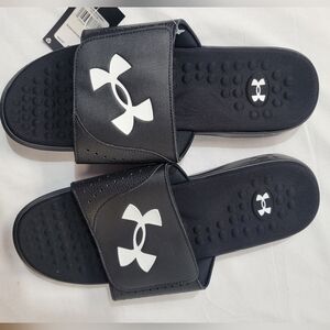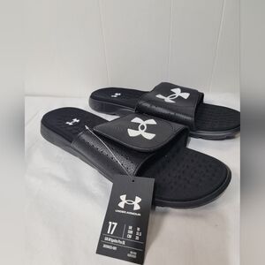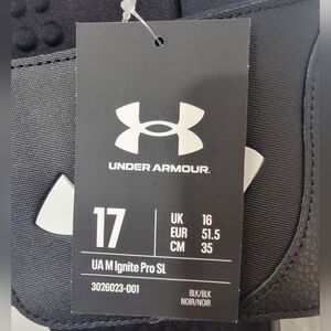 New With Tags Under Armour Ignite 7 Pro Slides Men's Size 17. Black and white, textured foam footbed, memory foam, adjustable synthetic strap, EVA outsole built with durable traction pods in heels.