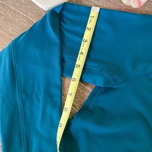 Beautiful rich peacock blue athleisure jacket. The color is more true in the first picture and the measuring pictures, it’s not faded.