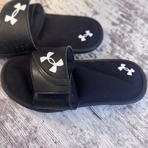 Comfortable and stylish, these Under Armour kids slide sandals are perfect for everyday wear. Featuring a sleek black design, they offer both durability and style. Only worn a few times. Smoke free home.