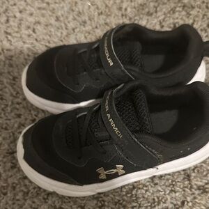 Durable black sneakers with white accents. Ideal for active kids. Easy to wear with secure straps.