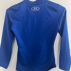 Stylish blue long sleeve shirt. Features Under Armour logo on collar. Perfect for active kids.