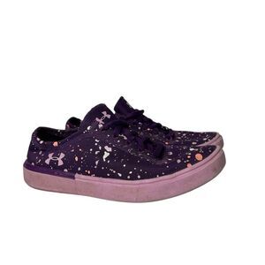 Experience the perfect blend of style and comfort with these Under Armour sneakers, featuring a striking purple upper with a speckled pattern and a contrasting pink sole. Designed for easy wear, these slip-on shoes offer a relaxed fit and a soft, canvas-like material for all-day comfort.