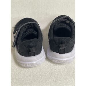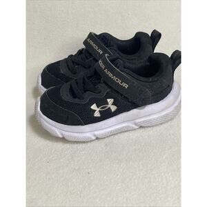 The product is a pair of Under Armour Kids' Shoes in size 5K. These sneakers feature a round toe shape, hook-and-loop closure, and moderate cushioning level for comfort and breathability. Made with a mesh fabric type, rubber outsole, and synthetic upper material, these shoes are suitable for various occasions such as travel, activewear, and casual wear. The black color with logo accents and solid pattern make them a stylish choice for boys who enjoy walking, running, and jogging. Perfect for all seasons, these athletic shoes from Under Armour are a great addition to any young boy's wardrobe.