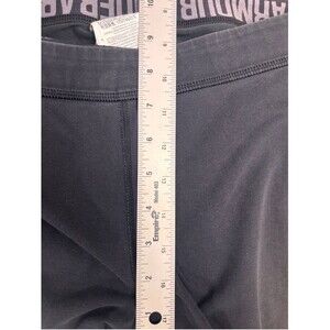 These are pre-owned Under Armour leggings, size Large. The leggings are black with white and gray stripes on the front of each leg. The waistband features the Under Armour logo. The material shows signs of wear, with some fading and slight pilling visible. The inseam measures approximately 27 inches, and the waist measures approximately 15 inches across when laid flat. There are no apparent rips or tears.