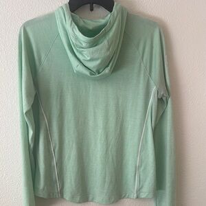 Light green pullover by Under Armour. Features a drawstring hood and long sleeves. Size M. Small stain on shoulder.