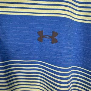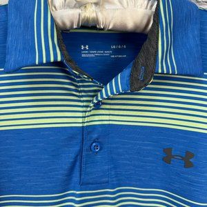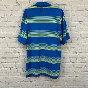 Under Armour Men's Loose Fit HeatGear Golf Polo Shirt, Size Large, Blue Color with Neon Yellow Stripes, 91% Polyester/9% Elastane