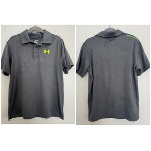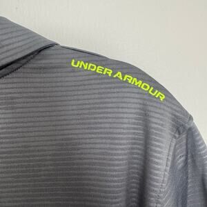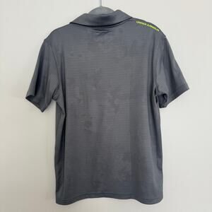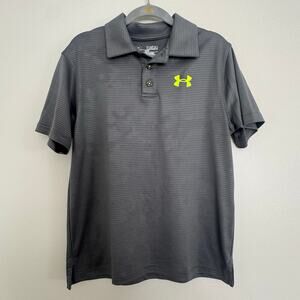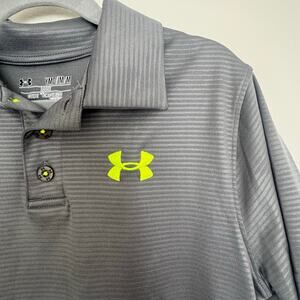 Size Youth Medium Under Armour Loose Fit, Heatgear Polo in 'Wavey' Gray. Embroidered Logo on chest and shoulder. Material is in EUC but there is a faint mark (pictured) that is extremely hard to see because of the stripe pattern.