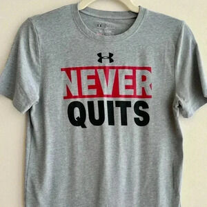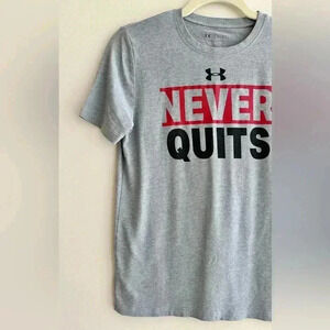 Under Armour Loose Fit "Never Quits" Grey Graphic T-Shirt, Size Youth Large
