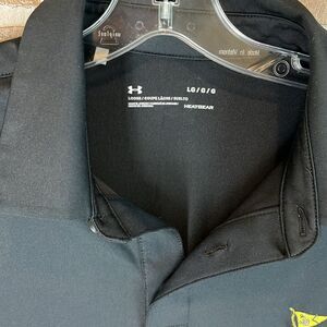 Under Armour, loose fit heat gear polo in black.  ELxcellent condition as shown in photos. embroidered flag logo.