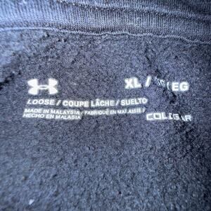 This is a loose fit Under Armour pullover hoodie featuring a bold USA flag–themed UA logo with surrounding stars, collegiate styling, and a classic kangaroo pocket. Marked XL / EG / Collegiate and made in Malaysia. Fabric is soft fleece interior, comfortable for daily wear, layering, workouts, or casual use. In good condition with some light surface wear/fading (see photos). No major stains, rips, or holes noted.