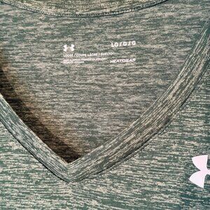 Under Armour brand, Women's Loose Heatgear V-neck activewear t-shirt; Short sleeves; Dark green marled color; Size Large; Back length = 26", front length = 24 3/4"; Excellent condition, only worn once.