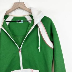 Peep this fantastic Under Armour hooded jacket! She exploded retro street wear jars with her loose, relaxed fit and perfectly paired green and pink color combo. White colorblock pockets, hem, sleeve cuffs, and shoulder accents really make this full zip hoodie pop! Loose fit and longer length. Contrasting pink stitching and pink logo on back. Green button detail on pockets.