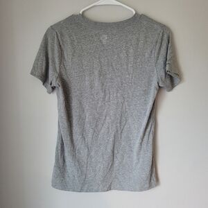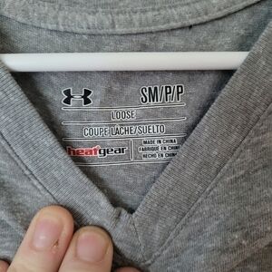 Under Armour 'Make History' V- Neck Tee. Women's size small. Preowned in good condition. Grey overall with black distressed writing. Loose fit.